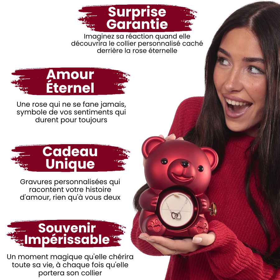 Notre Coffret Ours Éternel avec collier personnalisé caché est un cadeau qui dure toute une vie. Doté d'une véritable rose préservée qui durera toujours, ce cadeau est le symbole parfait de l'amour éternel.
