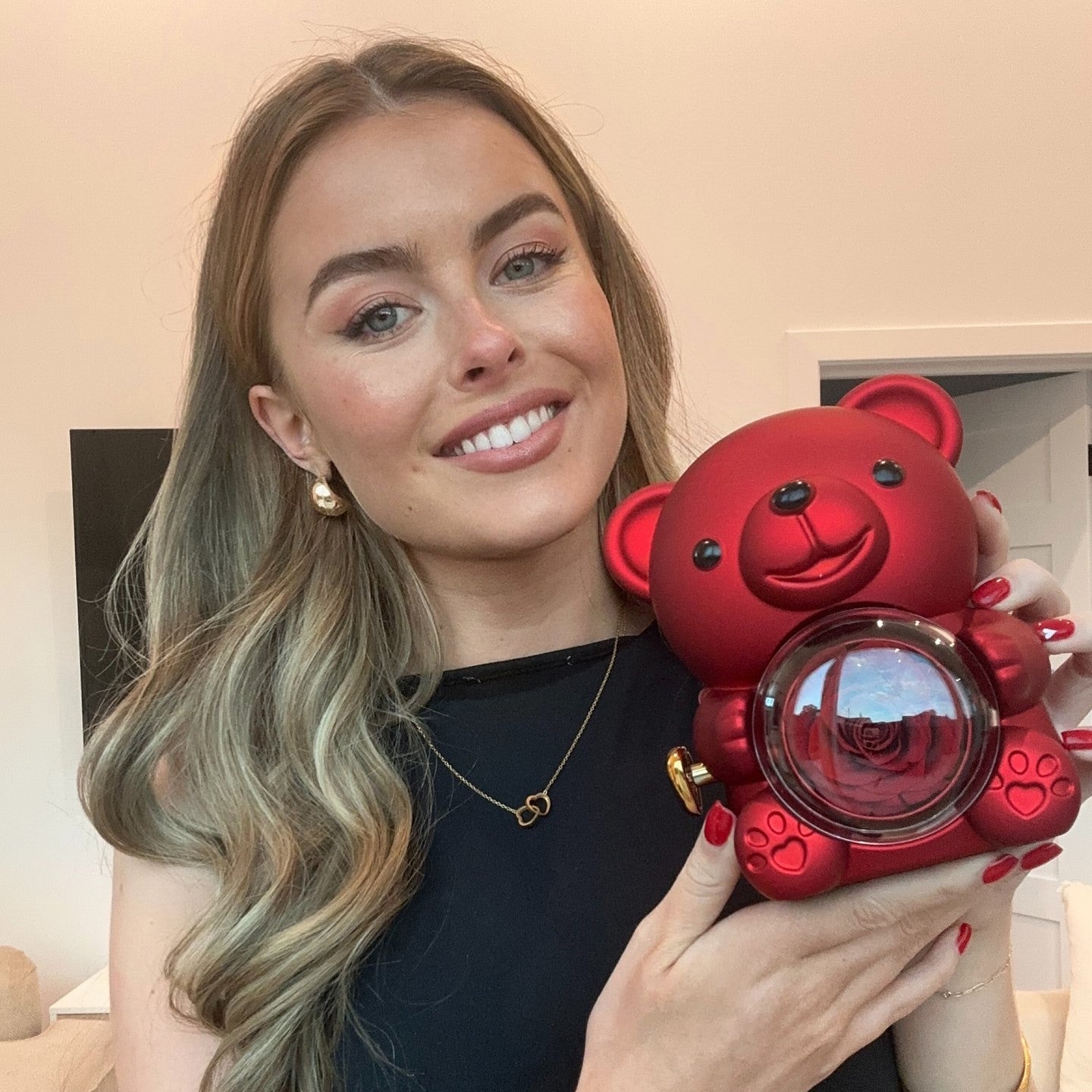Un adorable ours rouge renfermant une rose éternelle et un collier doré en forme de cœurs entrelacés. Un cadeau unique pour exprimer un amour sincère et durable. 💞